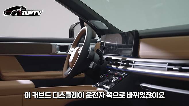 근데 GV80도 타고 있다가 싼타페를 타니까 커브드 디스플레이가 운전자 쪽으로 바뀌었잖아요. 그러니까 운전자가 보기에 더 편하게 돼 있는 것 같아요. 터치할 때도 조금 더 편할 거 같고요.