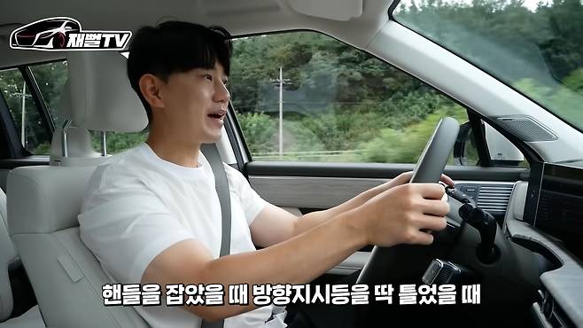 스마트 크루즈 컨트롤 테스트를 해볼 건데요. 핸들을 잡고 방향지시등을 틀었을 때 차선 변경이 자동으로 됩니다. 곡선보다는 직선 코스에서 더 잘돼요. 두 번째로는 반자율 주행하고 있을 때 손만 가볍게 올려놓고 있어도 핸들을 잡으라는 표시가 저희 차도 되게 잘 나와요. 손을 올려놓고 있는데 핸들을 또 잡아달라고 뜨는 거죠. 그럼 힘을 주거나 핸들을 살짝 조향해 줘야 하는데, 이번 싼타페는 생각보다 그 기능이 잘 들어가 있다고 해요. 손가락만 살짝 올려 놓아도 경고 표시가 안 뜨네요.