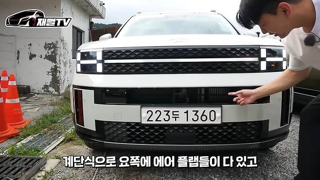 저는 싼타페 캘리그래피 모델의 기하학적인 문양 말고 아랫 등급 모델, 육각으로 깍둑깍둑 모양의 모델이 있어요. 저는 그 모델이 좀 더 싼타페랑 잘 어울리는 것 같아요. 전면은 진짜 좀 마음에 들거든요. 계단식으로 전면에 에어 플랩들이 다 있어요. 그리고 계단식으로 생각보다 곡선이 많아요. 곡선이 많다 보니까 공기저항계수가 낮았던 거죠. 굉장히 신경 써서 만들었네요.