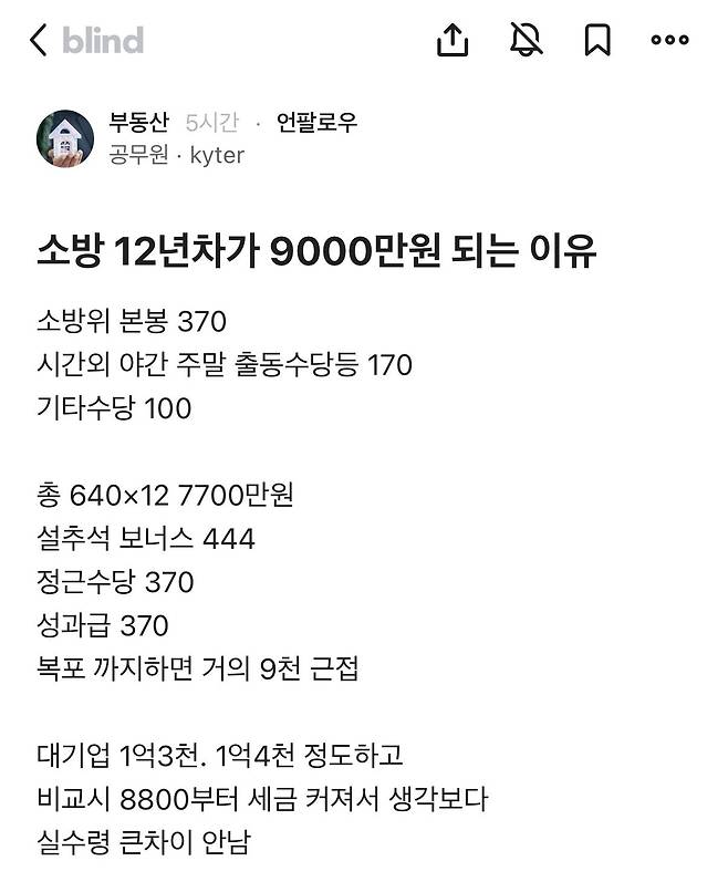 소방 12년차의 연봉이 9천만원에 육박하는 이유