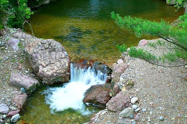 ◆ 바위와 소나무로 둘러싸인 신비로운 폭포