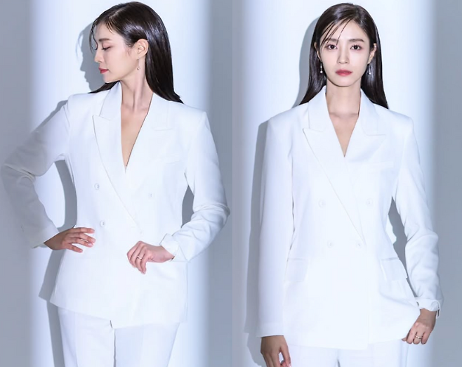 정인영은 올화이트 수트룩을 완성하며 우아하면서도 페미닌한 매력을 뽐냈습니다. 그녀는 라인이 살아있는 투버튼 브이넥 자켓을 입어 단정하면서도 세련된 이미지를 강조했고, 화이트 팬츠는 약간의 여유가 있는 스타일로 편안하면서도 고급스러운 느낌을 주었습니다. 정인영의 수트룩은 그녀의 품격 있는 이미지를 더욱 부각시켰습니다.