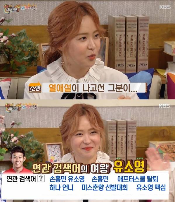 가장 구체적인 정황과 당사자의 언급이 있었던 열애설은 2015년 전 애프터스쿨 멤버 유소영과의 관계였다. 그녀는 손흥민을 만나기 위해 파주 NFC까지 직접 차를 몰고 갔고, 빼빼로데이에 데이트를 즐겼다는 보도도 있었다. 손흥민의 경기 세리머니가 ‘S자’ 모양이라며 유소영을 뜻한다는 해석까지 나왔다. 유소영은 열애를 인정하며 “좋은 감정으로 만나고 있다”고 말했지만, 손흥민은 “친한 누나일 뿐”이라며 다시금 선을 그었다. 이후 유소영은 방송에서 손흥민과의 연애를 쿨하게 인정하며 당시 상황을 묘사해 다시 한번 이목을 끌었다.