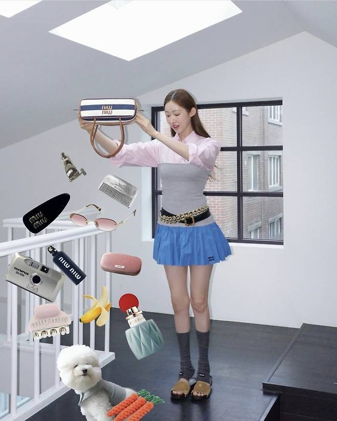 핑크 셔츠 위에 그레이 톱을 레이어드하고, MiuMiu 로고가 새겨진 푸른 플리츠 미니스커트를 매치한 룩으로 등장했습니다.