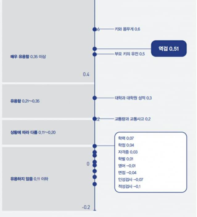 이 수치가 어느 정도로 정확한 것인지 이해를 돕기 위해 설명을 덧붙이자면, 도로에 차가 많으면 교통사고가 날 확률이 높아지는데 이 경우의 상관관계가 0.2 수준이다. 부모와 자식 간 키의 상관관계는 0.5 정도다. 참고로 학벌, 학력, 학점, 자격증 등의 예측 정확도는 0.11이고, 인적성검사와 영어점수의 예측 정확도는 마이너스(반비례관계)다. 앞서 언급한 한국경영학회와 마이다스 그룹이 16개 기업과 해당 기업에 재직 중인 약 4040명의 구성원을 대상으로 연구한 결과다.