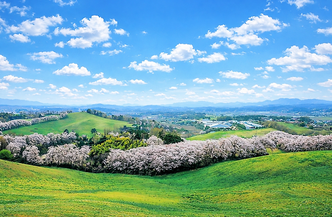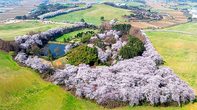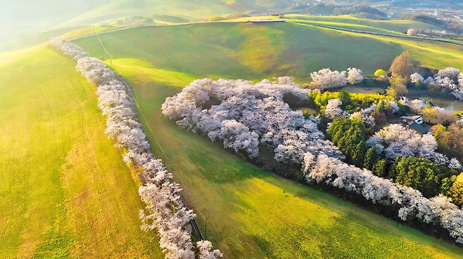 봄이 깊어지는 4월이 되면 충남 서산의 한 능선이 서서히 분홍빛으로 물든다. 흔히 보던 도심의 벚꽃길과는 분위기가 전혀 다르다. 빌딩과 도로 대신 끝없이 펼쳐진 초지와 완만한 구릉 위로 벚꽃이 피어나는 풍경이 눈앞에 펼쳐지기 때문이다.