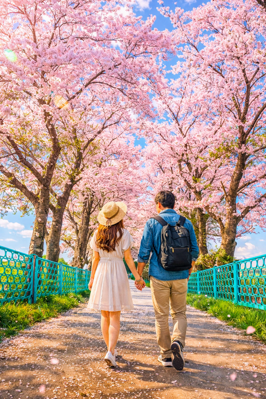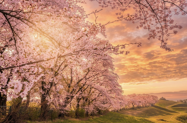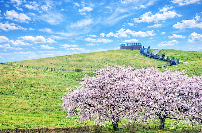 특히 4월 초에서 중순 사이가 가장 아름다운 시기다. 분홍빛 벚꽃과 노란 개나리가 드넓은 초지를 따라 이어지면서 마치 한 폭의 그림 같은 장면을 만든다. 나무 사이로 건물이 보이는 도심 풍경과 달리, 이곳에서는 하늘과 초지, 꽃만이 만드는 넓은 파노라마를 마주하게 된다.