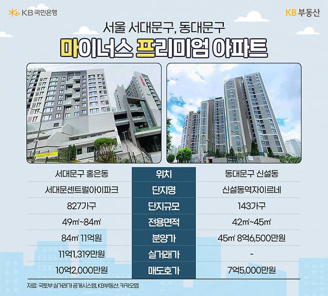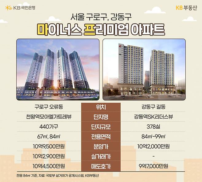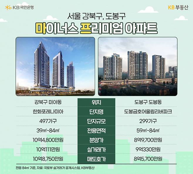 이제 더이상 '청약 당첨은 로또'라는 공식은 통하지 않는 것 같습니다. 서울 신축 아파트 시장에 분양가 보다 낮은 마이너스 프리미엄(마피), 無 프리미엄(무피) 매물이 속출하고 있기 때문입니다. 특히 서울 외곽을 중심으로 분양가보다 수 천만원, 많게는 1억원 이상 낮은 가격에 매물이 있다고 하는데요. KB부동산이 서울의 마이너스 프리미엄 아파트를 찾아봤습니다.