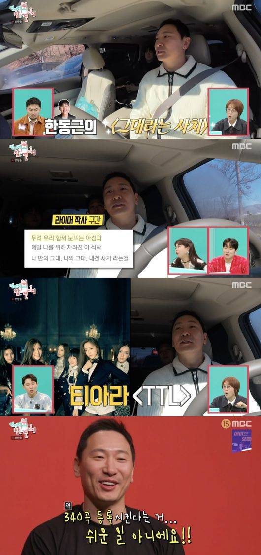 이동하는 차안, 음악 이야기를 나누던 중 한해는 “저작권 등록 수가 100곡이 넘는다”라고 자랑했다. 이에 질세라 라이머는 “나는 저작권협회에 330곡이 등록돼있다”라고 말했다. 문세윤은 효자곡은 뭐냐고 물었고, 라이머는 “효자곡은 한동근의 ‘그대라는 사치’다. 작사가로 참여했다”라며 자신이 작사한 구절을 직접 불렀다.