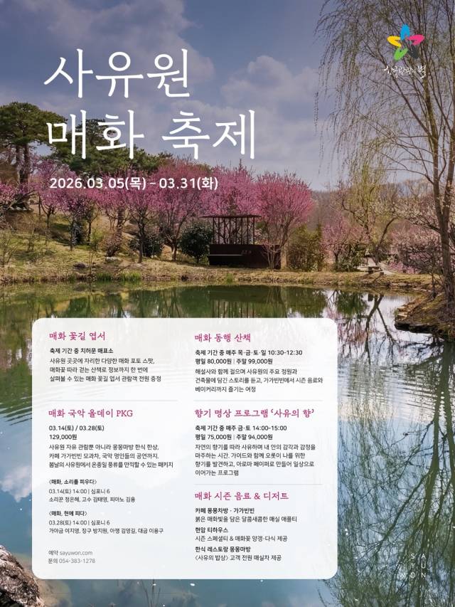 '2026 사유원 매화축제'가 오는 5일부터 31일까지 군위 사유원에서 펼쳐진다.
