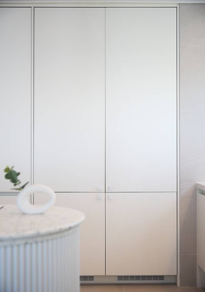 최대한 깔끔하고 심플하게 변화를 주고 싶었던 곳이 주방이라, 냉장고 자체를 빌트인으로 바꾸면서 전면의 모든 수납장과 빌트인 냉장고 커버까지 전부 맞춤 제작으로 진행했답니다. :)