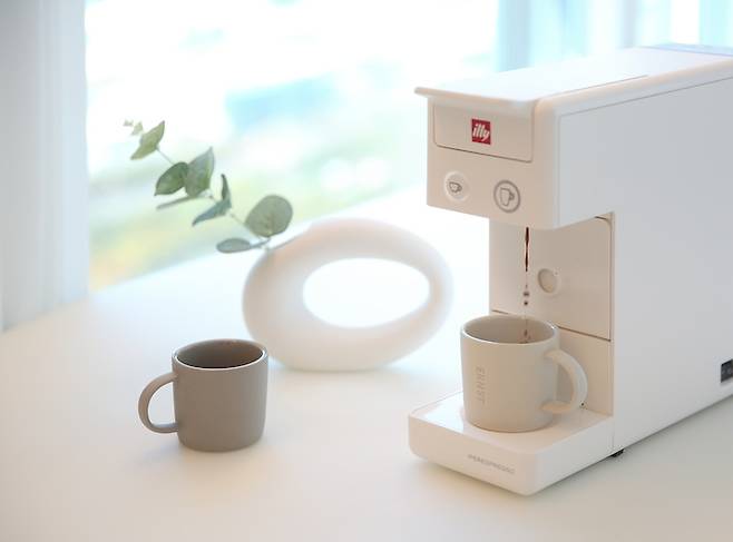 화이트 주방에 딱 어울리는 일리 커피 머신으로 커피도 내려 마시고요.