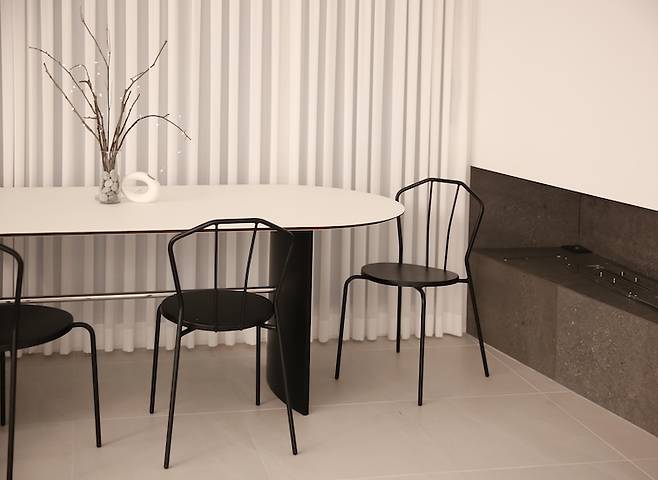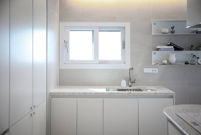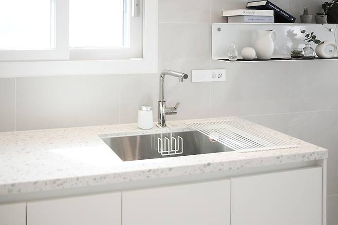 테라조 아일랜드 상판과 동일하게 싱크대 상판도 테라조로 선택하여 통일감을 줬습니다.