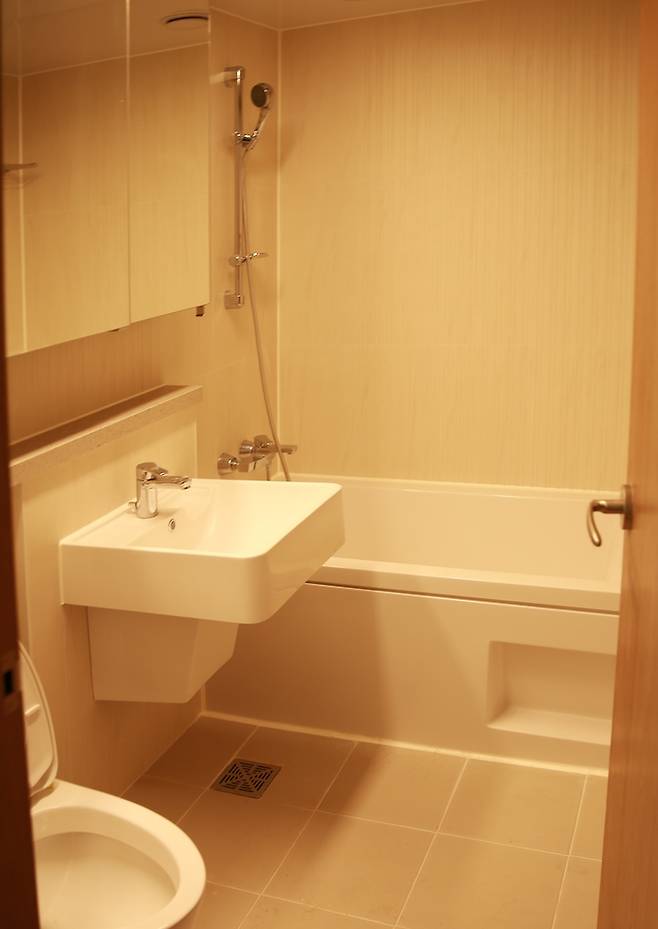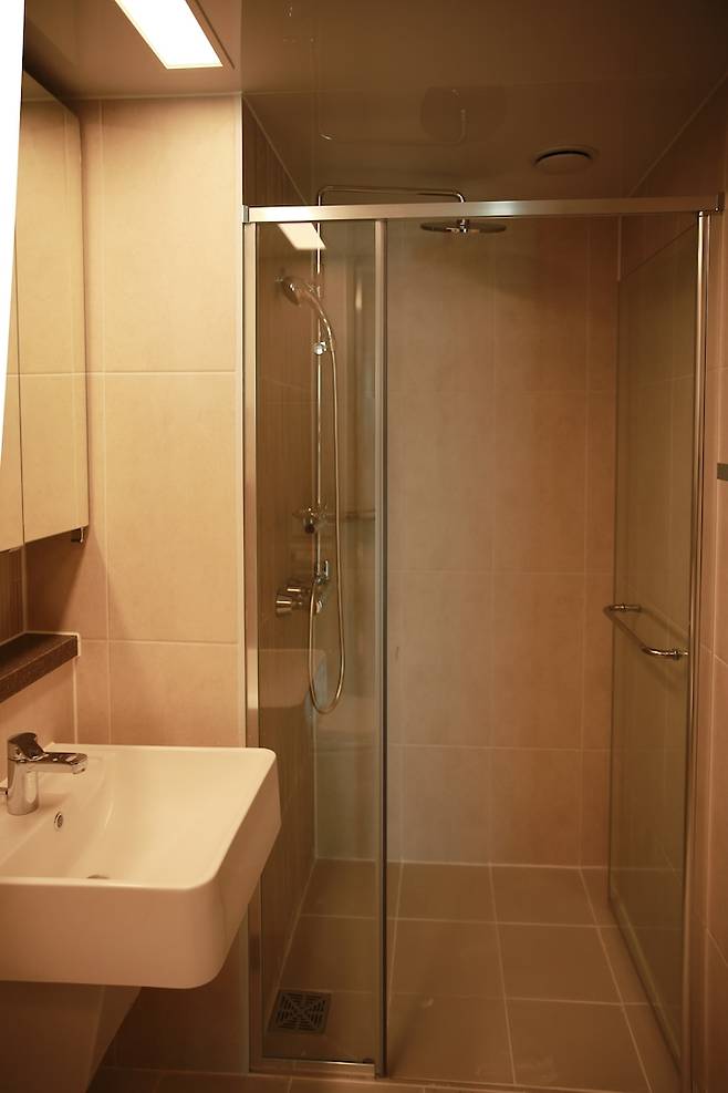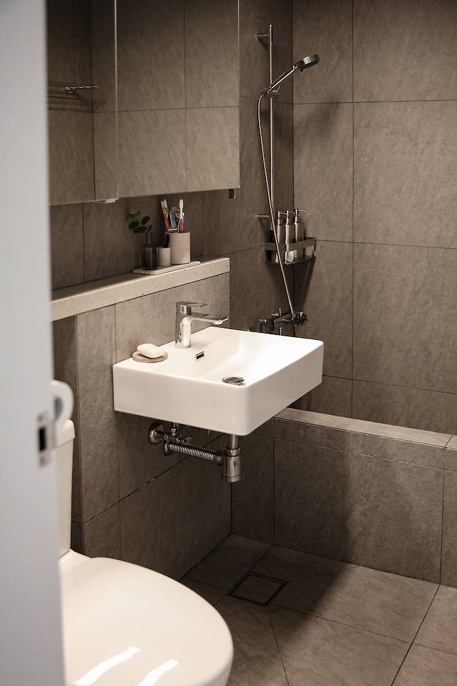 전체적으로 라이트 그레이 타일을 사용했고, 수전과 세면대, 샤워 수전과 샤워기 전체까지 전부 새 인테리어에 어울리도록 변경했어요! :)