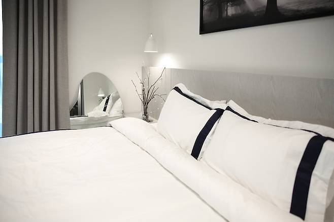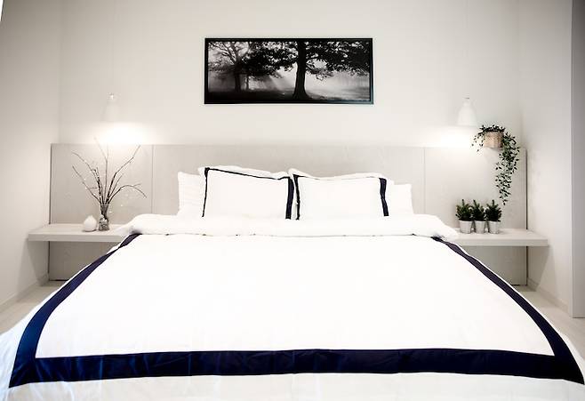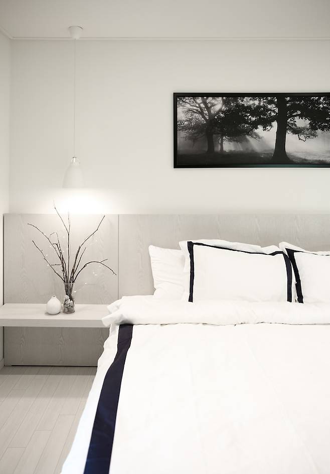 거실에서 침실 쪽 바라보면서 촬영한 사진이에요. 침실도 역시 최대한 심플하고 모던한 모습으로 꾸몄어요! :)