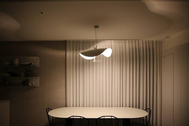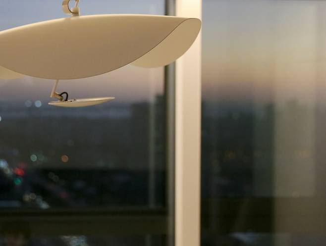밤에 식탁 등을 켜면 하늘에 예쁜 그림자가 져요. 모양이 마치 챙이 큰 모자처럼 보이기도 하고 영국 왕실 행사 때 귀족이나 왕족이 쓰는 예쁜 햇의 느낌도 나서 선택한 조명이랍니다! ㅎ