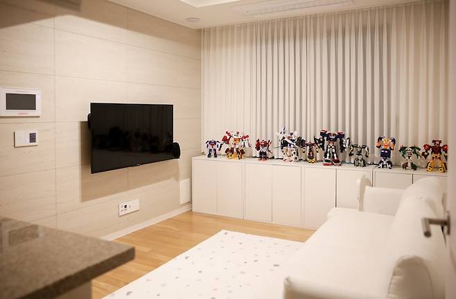 아이 장난감 수납장과 미디어 시청을 위한 티브이, 작은 간이 소파 정도로 가구를 최소화하였어요. :)