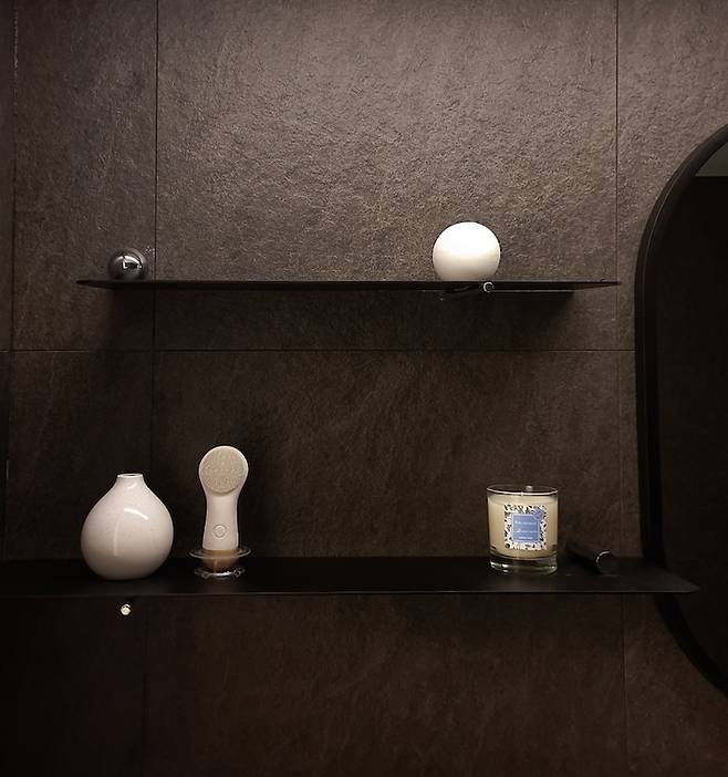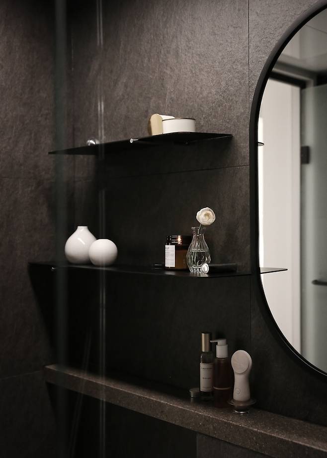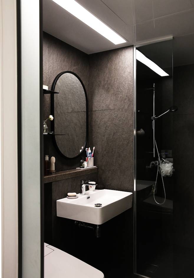 안방 화장실은 거실 화장실보다 훨씬 다크한 컬러의 그레이 타일을 사용했어요. 블랙 앤 화이트 컨셉으로 전체적인 분위기를 잡았답니다.