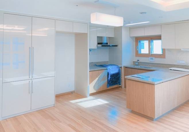 부엌 인테리어 시공 전의 모습이에요. 파란 비닐이 곳곳에 붙어 있고, 냉장고 자리 한 칸이 비워진 것 보이시나요?