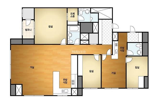 도면에서 보이는 것처럼 저희는 메인 거실인 큰 거실과 작은 거실, 각각 2개의 거실이 있는 분리형 타입의 아파트예요!