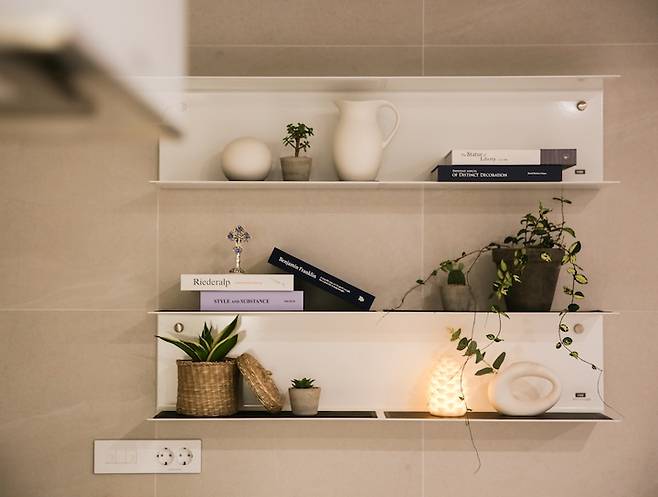 밋밋해 보이는 주방 벽면에 선반으로 포인트를 주었어요!