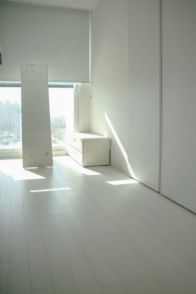깔끔한 화이트와 연그레이로 컨셉을 잡고 디자인한 안방이에요. 방 안은 차가운 타일 소재를 사용하지 않고 아주 밝은 톤의 그레이 마루를 깔아서 타일보다 덜 차가워 보이고 안정감이 느껴져요! :)