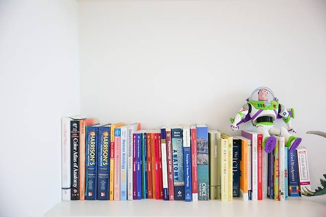남편이 의과 대학을 졸업해서 전공 서적이 정말 정말 많아요. 책장에 꽂을 수 없을 만큼 많기도 하고 책들이 하나같이 무거워서 책장이 휘어질 지경이라 겸사겸사 알록달록한 몇 권들은 빼놓고 이렇게 인테리어 소품(?)으로도 활용한답니다.