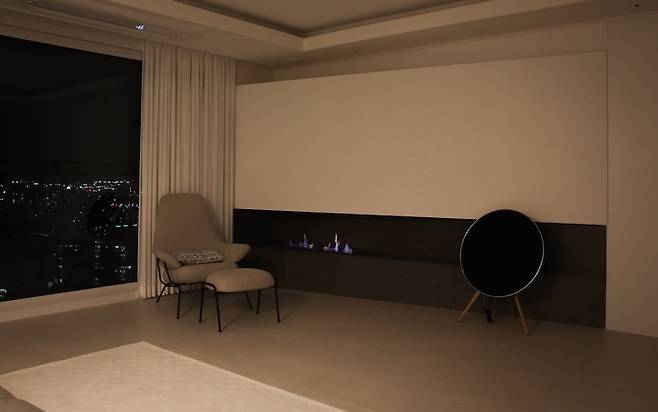 빔 스크린 아래 공간은 어떨지 궁금하셨던 분들도 계실 거 같아요. 아래는 저희 부부의 야심작인 바로 벽난로가 있답니다!