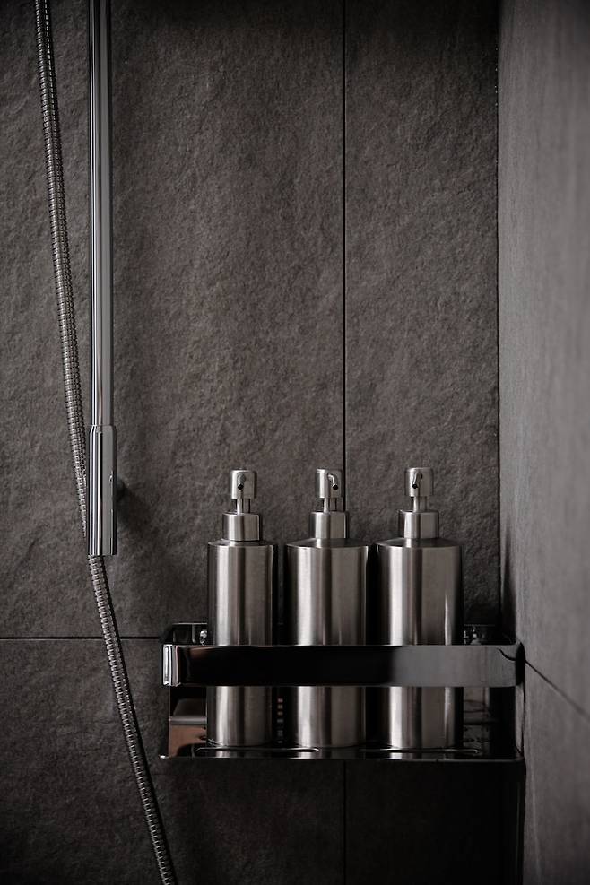 안방 화장실은 거실 화장실보다 훨씬 다크한 컬러의 그레이 타일을 사용했어요. 블랙 앤 화이트 컨셉으로 전체적인 분위기를 잡았답니다.
