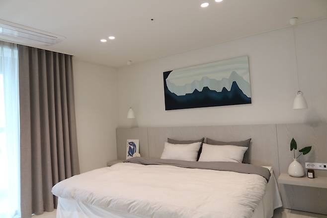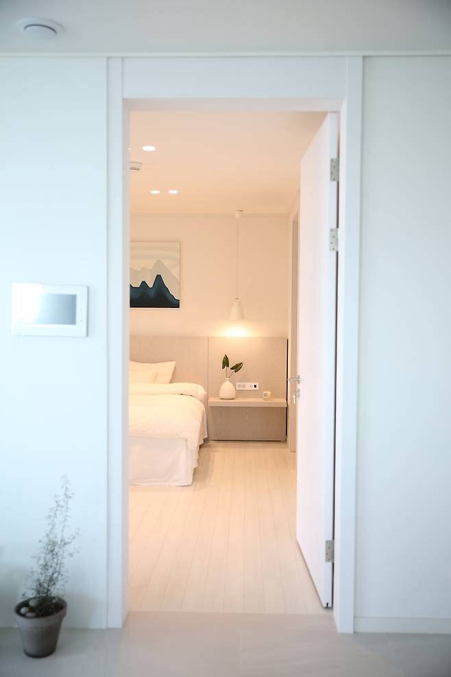 거실에서 침실 쪽 바라보면서 촬영한 사진이에요. 침실도 역시 최대한 심플하고 모던한 모습으로 꾸몄어요! :)