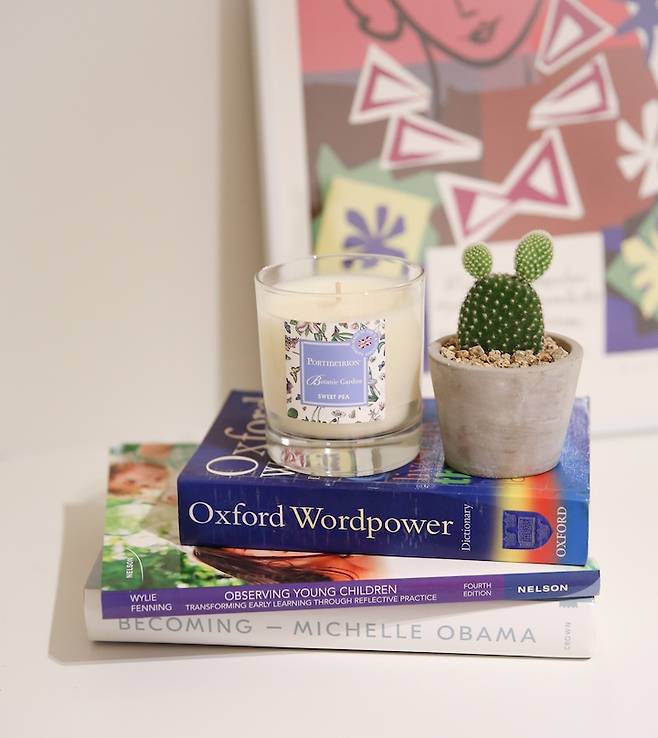 남편이 의과 대학을 졸업해서 전공 서적이 정말 정말 많아요. 책장에 꽂을 수 없을 만큼 많기도 하고 책들이 하나같이 무거워서 책장이 휘어질 지경이라 겸사겸사 알록달록한 몇 권들은 빼놓고 이렇게 인테리어 소품(?)으로도 활용한답니다.