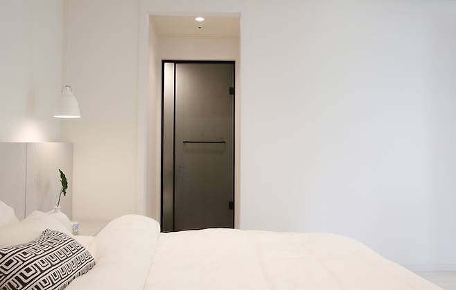 침실에서 보이는 블랙 테두리 문은 부부 욕실로 이어집니다.