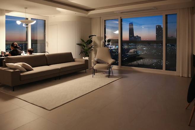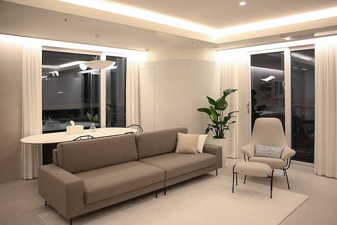 거실 창가 라인을 따라 간접 조명을 시공했어요. 모든 조명을 소등하고 창가 가장 바깥쪽의 등만 켜놓았을 때 특히 분위기 있어 보여서, 시공 후에 참 만족스러웠던 부분입니다. :)