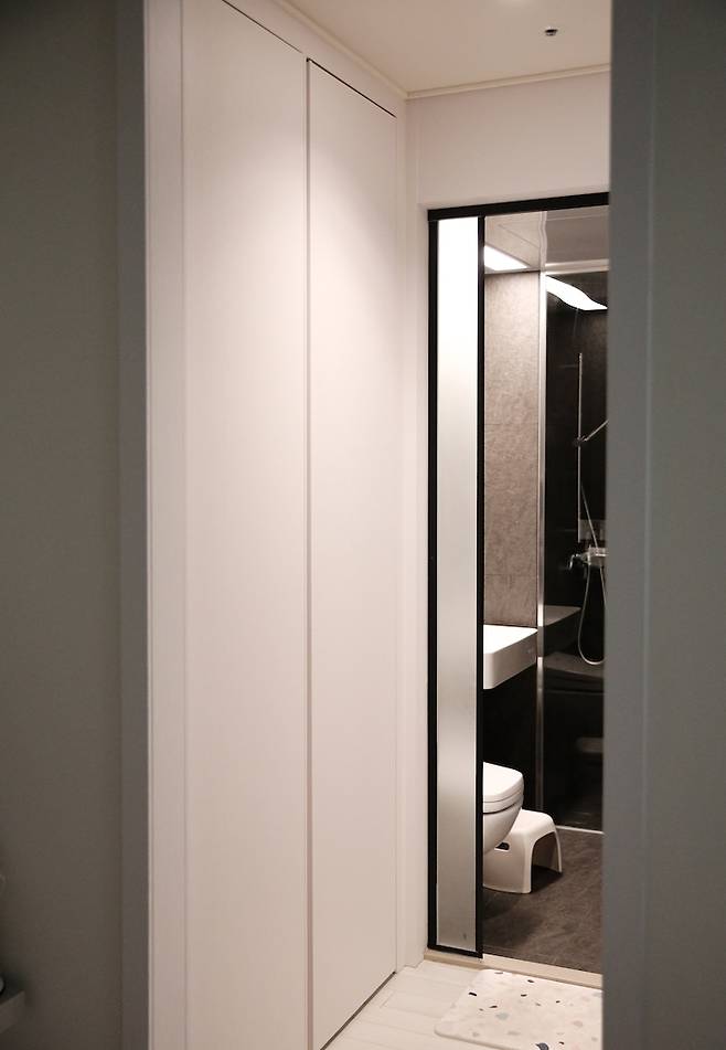 깔끔한 화이트와 연그레이로 컨셉을 잡고 디자인한 안방이에요. 방 안은 차가운 타일 소재를 사용하지 않고 아주 밝은 톤의 그레이 마루를 깔아서 타일보다 덜 차가워 보이고 안정감이 느껴져요! :)