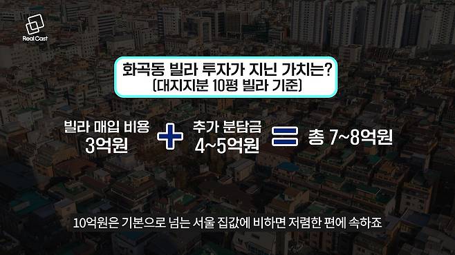 화곡동 인근 공인중개사들의 전언에 따르면, 화곡1동 추가분담금이 대지지분 10평 빌라일 시 4~5억원 정도 들 것이라고 합니다. 그럼 전용면적 84㎡ 아파트 입주권이 총 7~8억원(빌라 매입 비용 3억원 가정) 정도 소요되는 것인데요. 10억원은 기본으로 넘는 서울 집값에 비하면 저렴한 편에 속하죠.