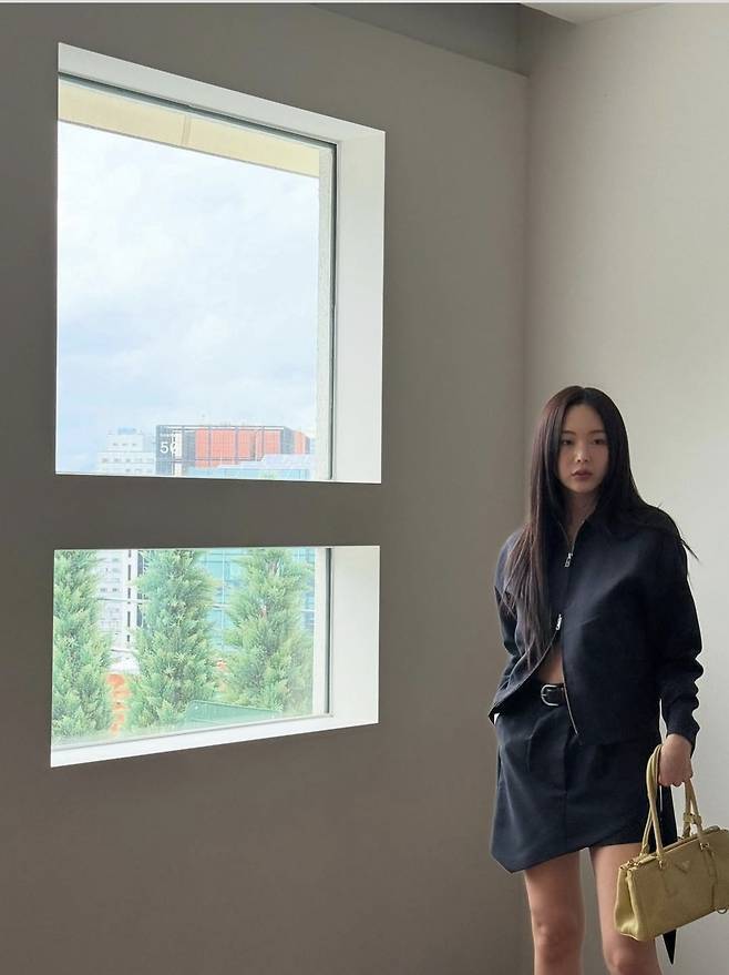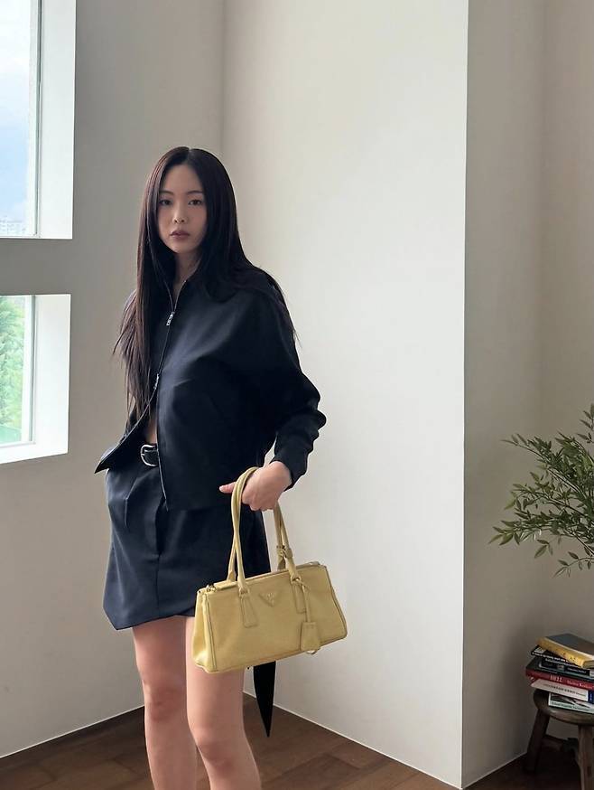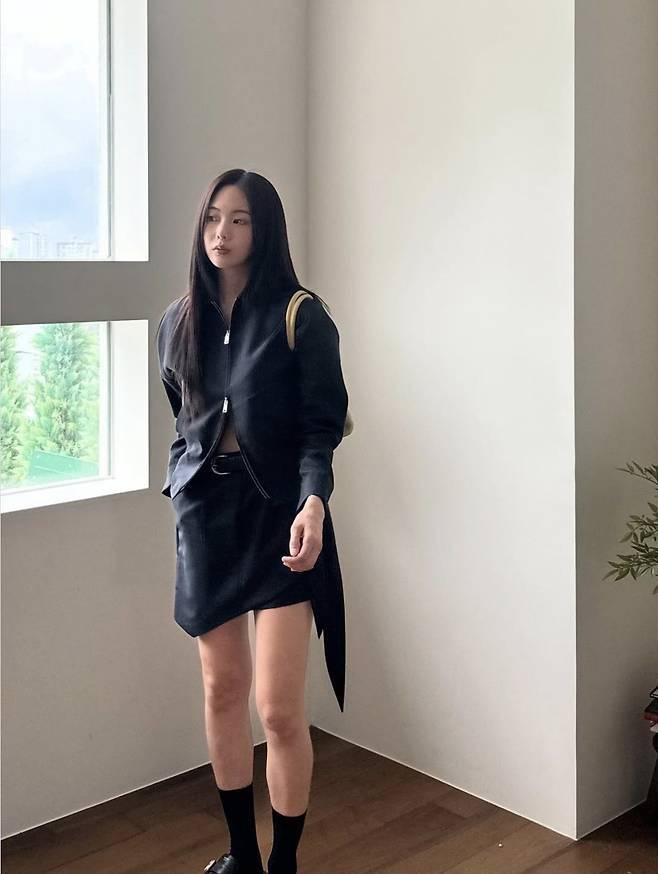 집업 스타일의 블랙 상의에 언밸런스한 밑단 디테일의 미니스커트를 매치해 감각적인 실루엣을 완성했으며, 블랙 삭스와 벨티드 샌들로 무드를 맞춘 스타일링이 도시적인 분위기를 배가시켰습니다.