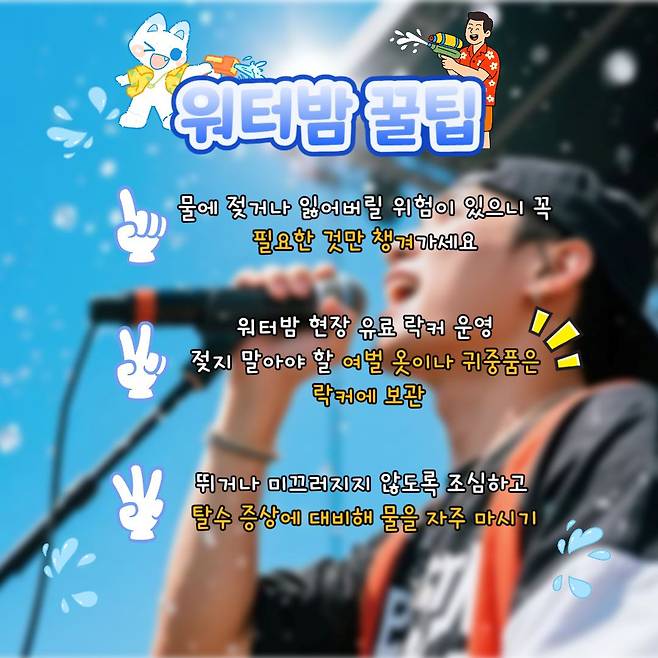 워터밤 행사가 끝나면 젖은 옷을 갈아입어야 하니 반드시 준비해두기(지퍼백에)