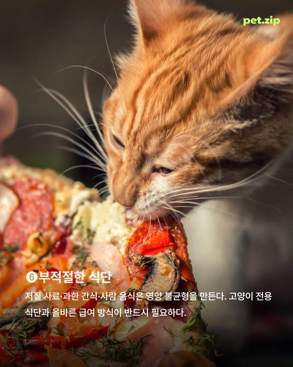 저질 사료, 과한 간식, 사람 음식은 영양 불균형과 소화 문제를 일으킵니다. 장기적으로는 비만·신장 질환 위험을 높이기 때문에 반드시 고양이 전용 식단이 필요합니다.