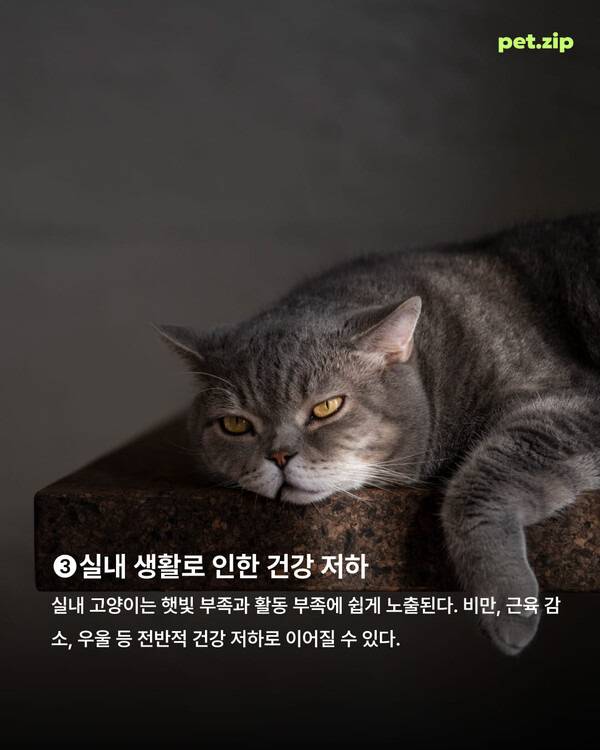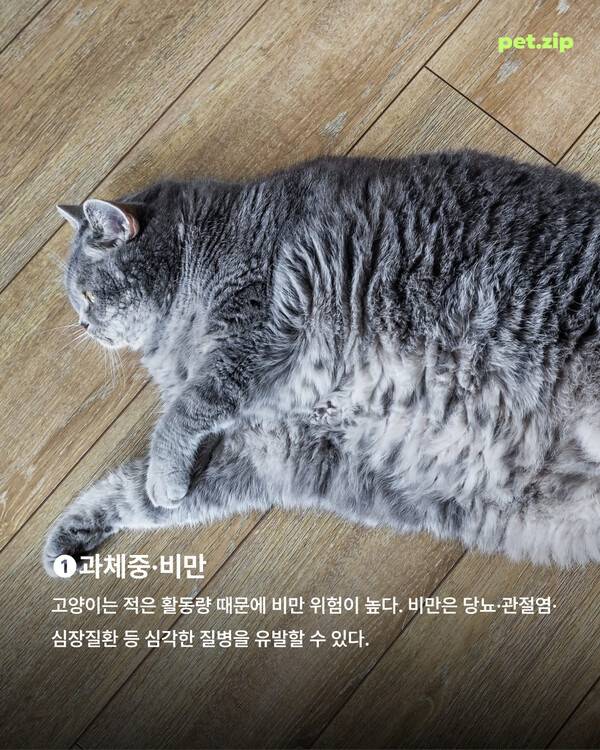 운동량이 적은 실내 고양이는 비만 위험이 높습니다. 비만은 당뇨병, 관절염, 심장 질환과 같은 만성 질환으로 이어져 수명을 단축시키는 대표 요인입니다.