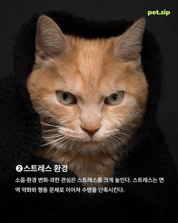 고양이는 소음, 낯선 냄새, 환경 변화에 민감해 스트레스를 쉽게 받습니다. 과한 간섭, 잦은 손길 역시 고양이에게는 압박이 될 수 있습니다.