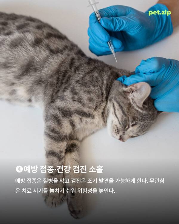 기초 예방 접종은 치명적인 바이러스성 질환을 막고, 정기 검진은 질병을 조기에 발견할 수 있게 합니다. 이를 소홀히 하면 치료 시기를 놓쳐 위험성이 높아집니다.