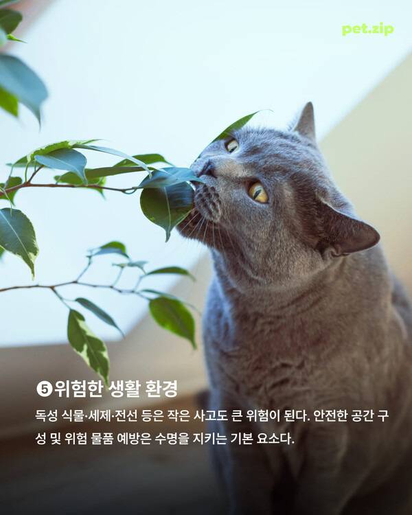 독성 식물, 세제, 전선, 작은 잡동사니는 고양이에게 큰 사고로 이어질 수 있습니다. 특히 독성 식물은 소량 섭취만으로도 구토, 장기 손상을 유발합니다.