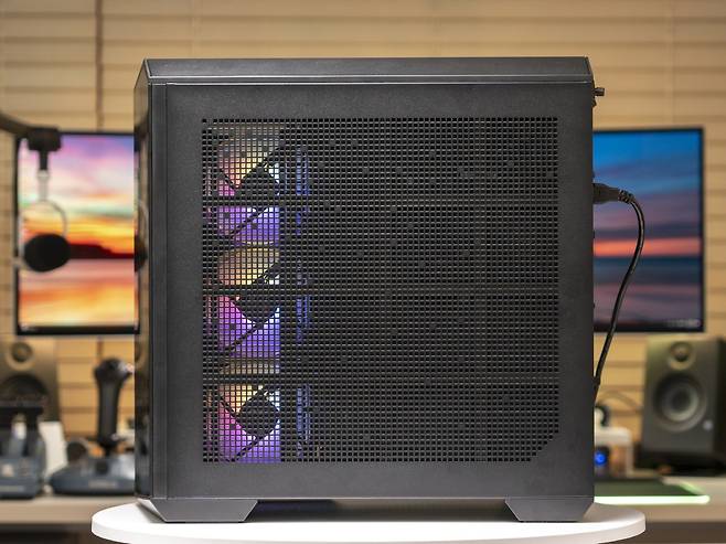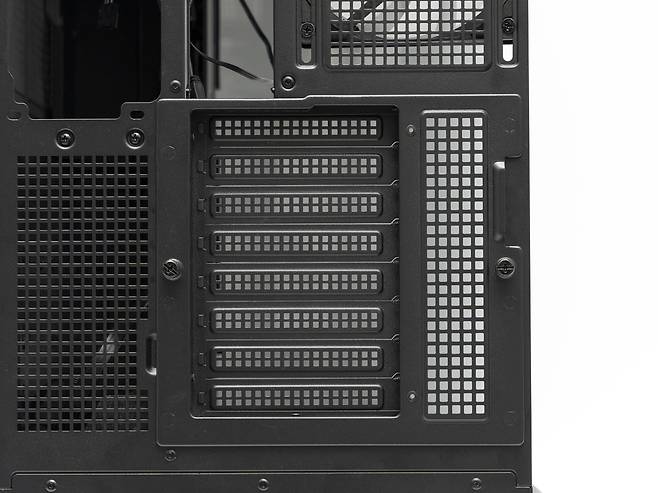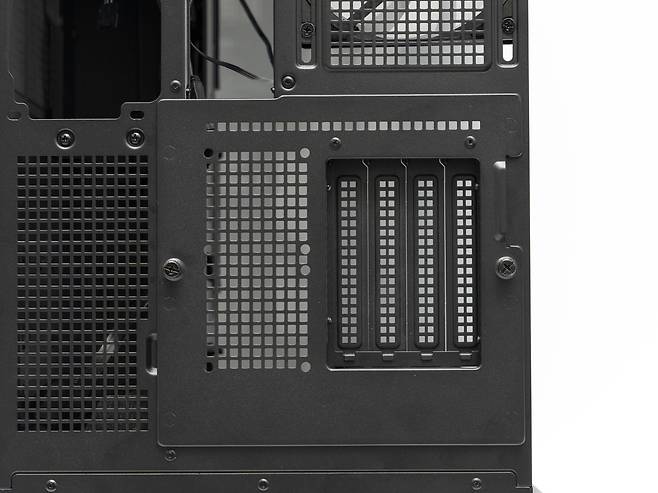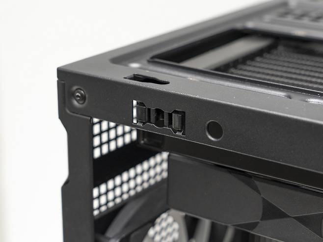 측면 스틸 패널은 공기흐름을 위해 넓은 면적이 타공 처리가 되어 있으며 먼지의 유입을 방지하기 위해 안쪽에는 먼지 필터가 부착되어 있습니다. 케이스 상단 커버와 하단에도 먼지 필터가 부착되어 있습니다.