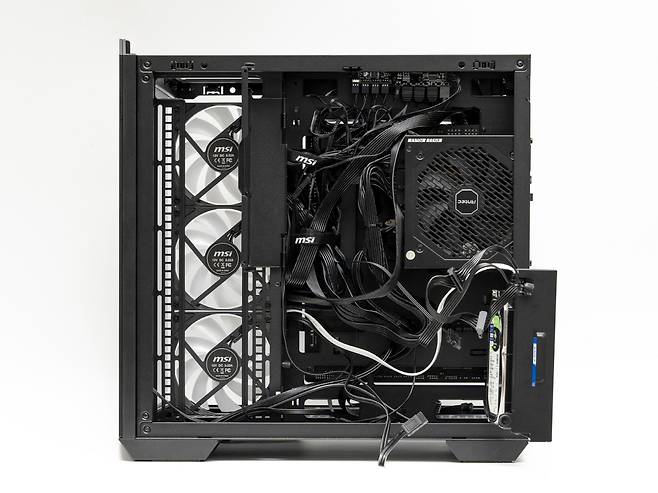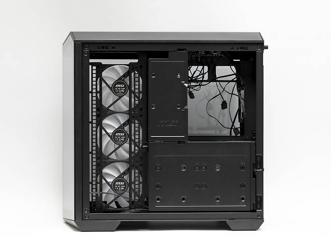 MSI MAG PANO 100R은 듀얼체임버 설계로 90mm에 달하는 넉넉한 케이블 정리 공간이 제공되는데요, 특히 스토리지 장착이 가능한 측면 커버로 케이블 정리가 상당히 간편한 것이 장점입니다.