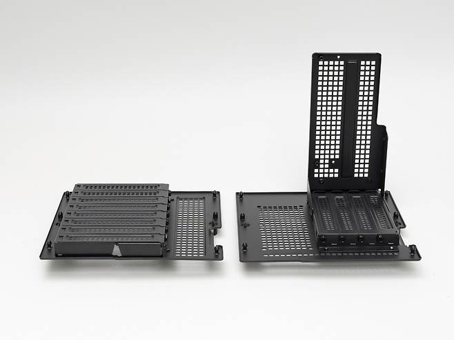 스토리지는 측면 스윙 도어에 최대 3개의 2.5인치 SSD 또는 2개의 2.5인치 SSD + 3.5인치 HDD를 장착할 수 있고, 하단부 브래킷에는 2.5인치 SSD 2개를 추가로 장착할 수 있습니다.