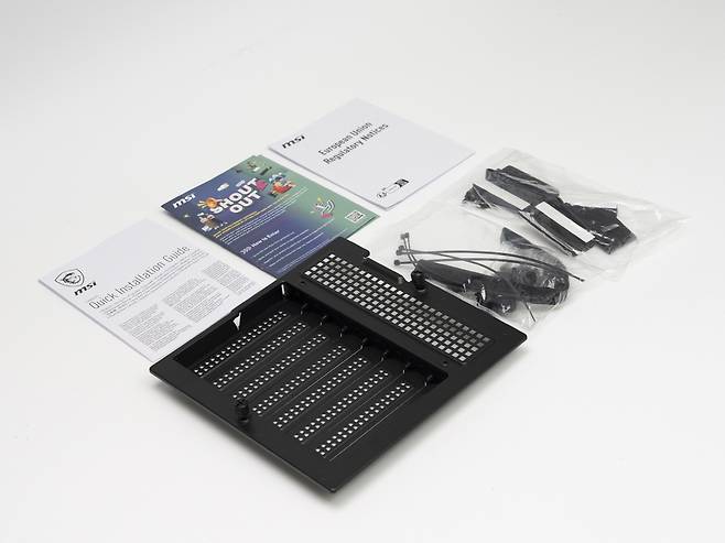 구성품으로는 MSI MAG PANO 100R 본체, 사용자 설명서, 각종 나사 및 케이블 타이, 그리고 그래픽카드 지지대가 포함되어 있습니다.