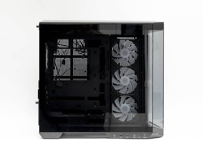 I/O 포트는 케이스를 책상 위에 올려놓고 사용하는 사용자를 위해 측면 하단에 배치를 하였으며, 포트의 구성은 좌측부터 USB 3.2 Gen2x2 Type-C, USB 3.2 Gen1 Type-A x 2개, 마이크/오디오 콤보, LED 스위치, 파워 버튼으로 구성되어 있습니다.