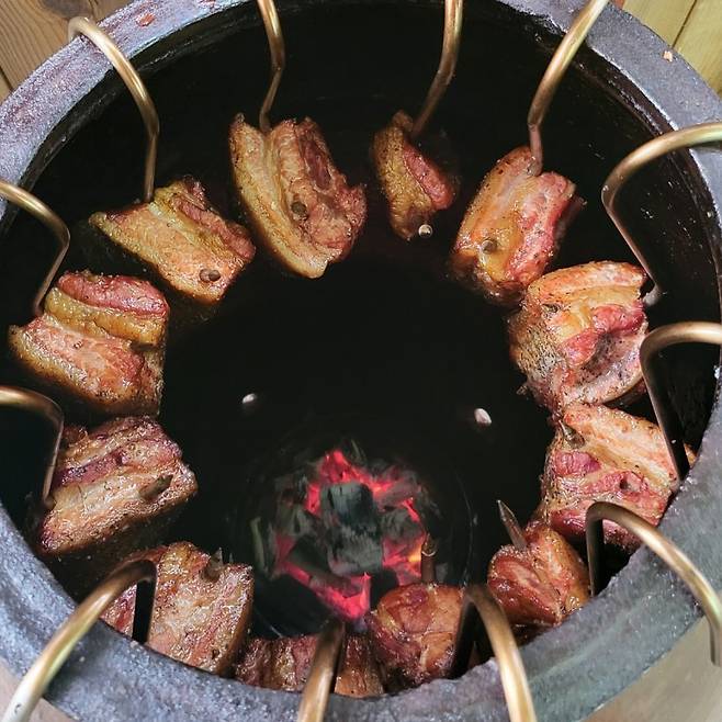 항아리에 참숯을 넣어 구워주는 육즙 가득한 삼겹살 맛집을 소개한다.