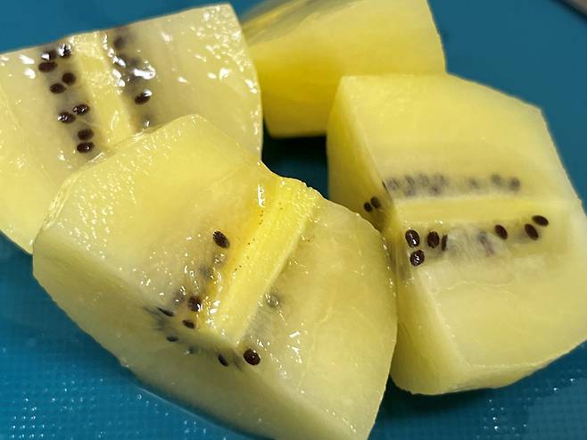사과 1/2개와 키위 1개도 세척한 다음 적당한 크기로 잘라서 준비하세요.