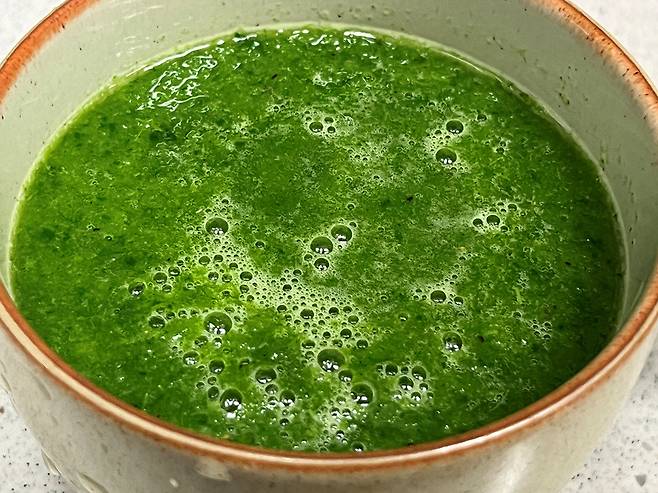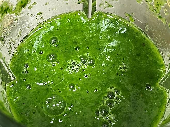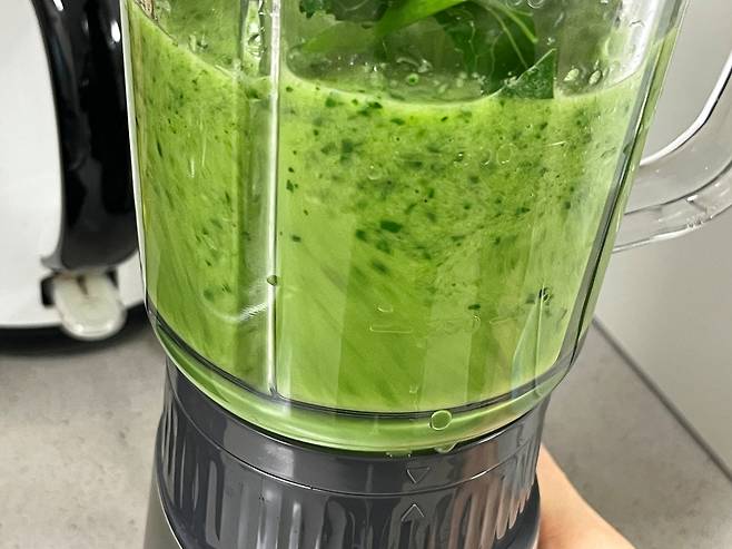믹서에 곱게 갈아주면 케일주스가 완성됩니다. 사과와 키위가 들어가 상큼하면서 은은한 단맛도 나서 먹기에 큰 거부감이 없습니다.